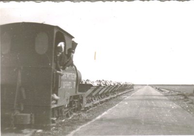 de locs lieten vallen. 's Avonds zag je dan overal zwarte pluimpjes uit de schoorstenen van de huizen komen. Bij het eindpunt van de lijn, aan de noordkant van het vliegveld, lagen een paar wissels, een loods waar de locs 's nacht in stonden en een berg steenkool.